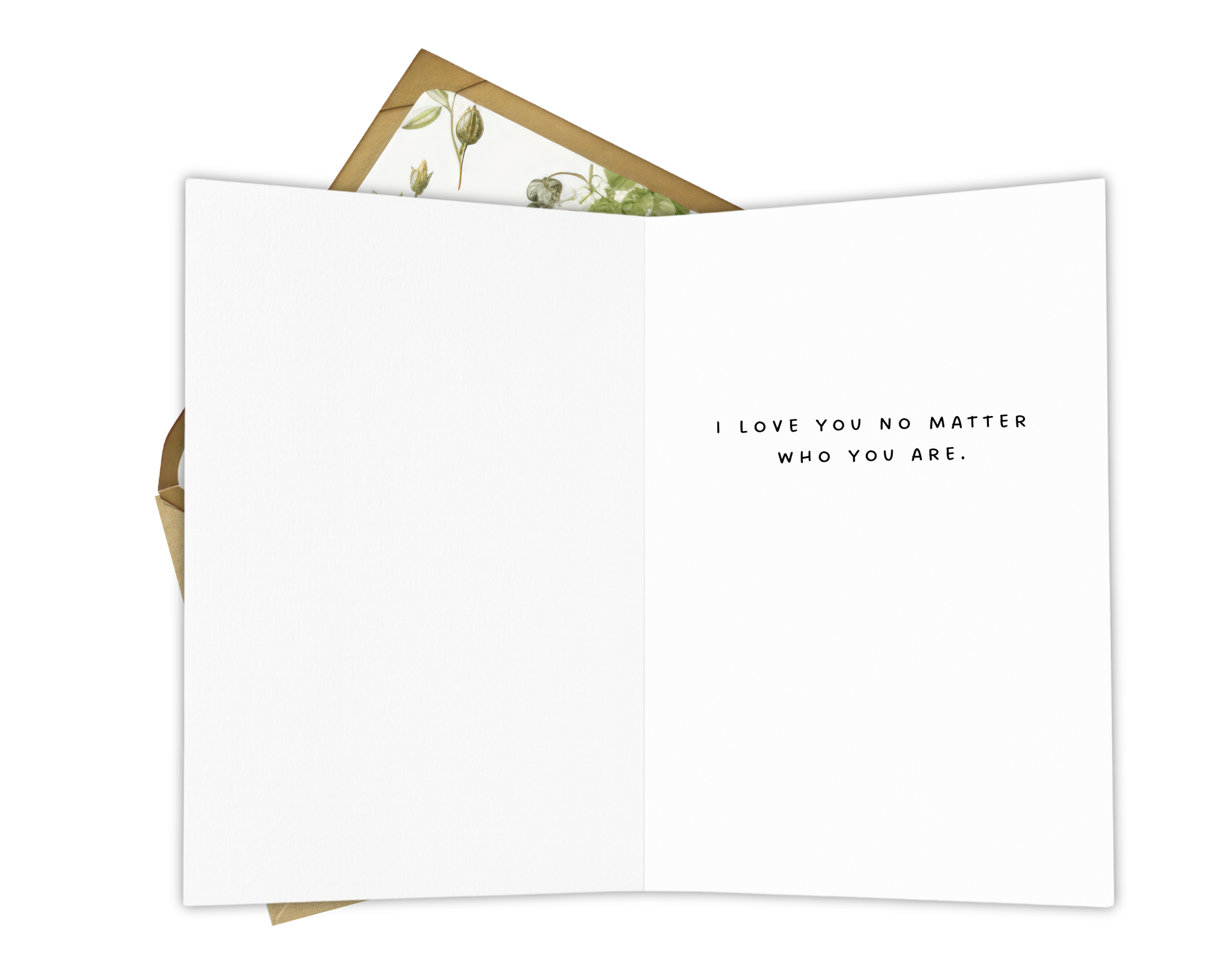 Love doesn’t change based on how someone identifies. This card design uses visual wordplay to center pronouns while the inside delivers a clear message — you are loved, seen, and affirmed.
